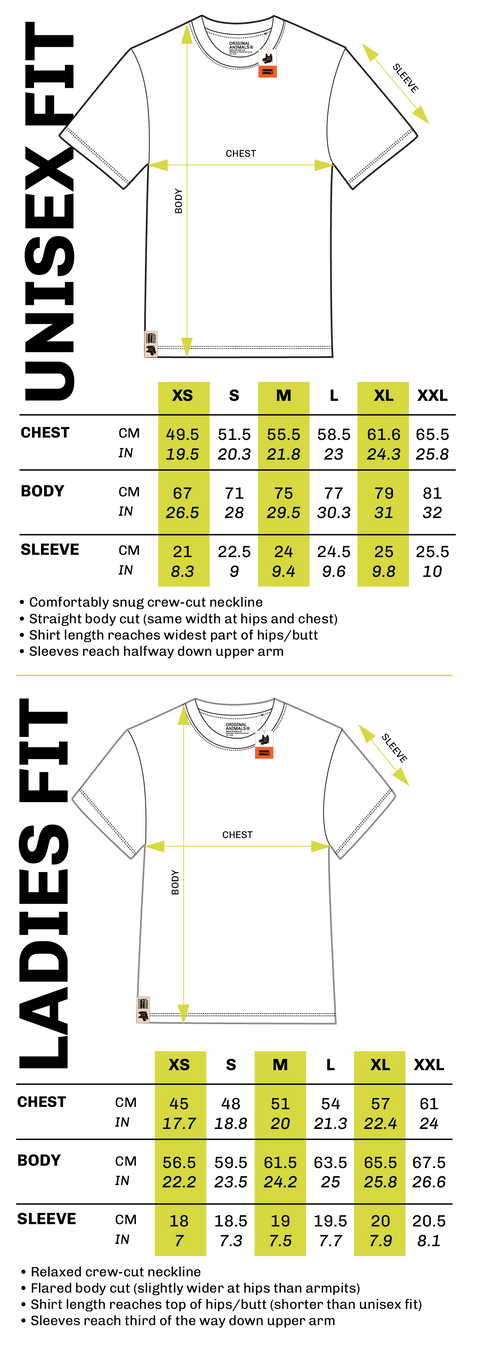 **Ladies fits are at least 1 size smaller than unisex (i.e. if you wear a small in unisex, you may prefer a medium or large in ladies). Always measure first before buying!